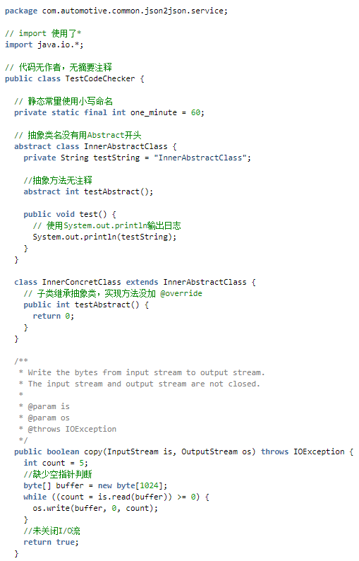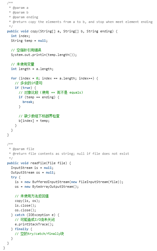 如下测试代码 TestCodeChecker.java 中将包含开发中的几种常见错误,如引用操作、对象操作、表达式复杂化、数组使用、未使用变量或代码段、资源回收、方法调用及代码设计几个方面。所有的缺陷检查都是用工具的默认检查规范设置,代码的注释部分列举了代码中可能存在的缺陷。
