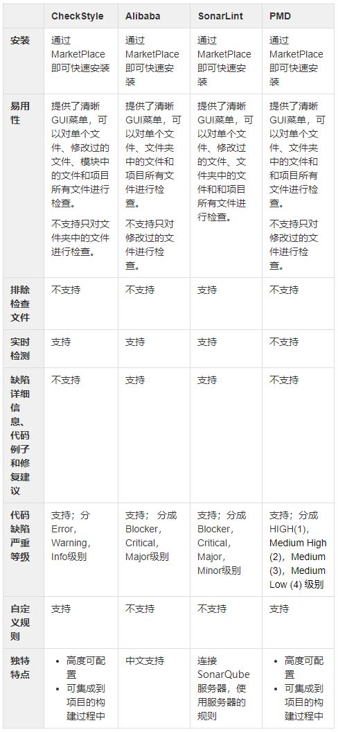 本文从安装、菜单项和 GUI 界面、工具的特点以及使用方式几个方面详细介绍了 Checkstyle,Alibaba Java Coding Guideline,PMD 四种主流的 Java 代码规范工具,并通过一段 Java 测试代码对这四种工具的代码分析能力进行比较。这四种工具内置不同编程规范,对不同种类的代码问题的发现能力有所不同,对于代码检查各有侧重:Checkstyle 和 Alibaba 更加偏重于代码编写格式检查,而 SonarLint,PMD 着重于发现代码缺陷。个人建议是将这两种侧重点不同的工具组合起来一起使用,例如【Alibaba+SonarLint】或【Checkstyle+PMD】,这样才能较全面的发现和修复代码问题。就本人而言,比较偏向于使用【Alibaba+SonarLint】的组合,因为这两种工具都提供了缺陷详细信息、代码例子和修复建议,对于开发者十分友好,另一个重要的特性是 SonarLint 可以和 SonarQube 服务器连接,使用统一的编程规范检查代码。