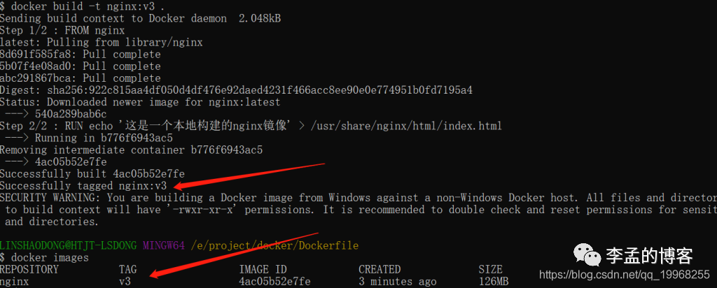 在 Dockerfile 文件的存放目录下,执行构建动作。以下示例,通过目录下的 Dockerfile 构建一个 nginx:v3(镜像名称:镜像标签)。注:最后的 . 代表本次执行的上下文路径。