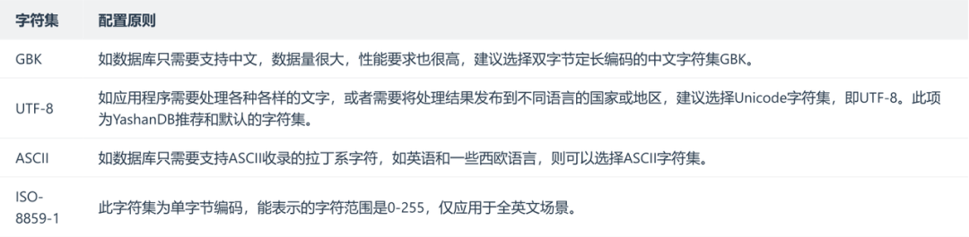 字符集方面,常见的中文字符集(gbk、gb18030)及utf8系列字符集是支持重点。从官网上查看YashanDB支持的字符集,具体如下。针对字符集排序方面,YashanDB 支持部分Oracle排序能力,还有部分尚不支持。
