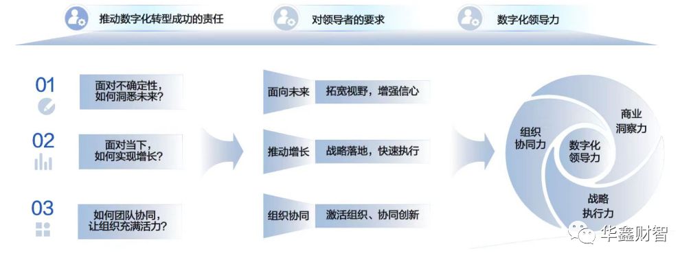 数字化时代的到来,让领导力的定义和要求发生了变化,要求企业的管理者必须要进行全方位的转身,如何洞悉未来?在面对当下,如何实现增长?面对未来,如何激活组织,发展新型领导者?概括的讲数字化领导力是指在数字化环境下,领导者所具备的能力和素质。从2016年以来,华为在数字化转型上取得的成就有目共睹,结合华为数字化转型的经验,华为把数字化领导力总结为三力:数字化商业洞察力、数字化战略执行力、数字化组织协同力。