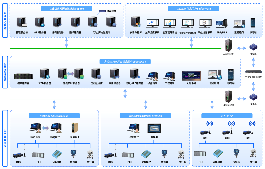 从产业链安全角度看,SCADA平台支持全国产化技术栈,与主流操作系统、CPU及主机、PLC等设备厂商完成了兼容认证,可在异构平台混合交叉部署。从外部防护角度看,力控科技关注工控系统本质安全,依托自主的工业防火墙、安全隔离网关、安全审计等防护产品形成了成熟的工控信息安全方案。