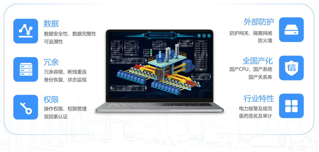 针对逐步升级的挑战,力控科技提出的SCADA 系统安全防护设计方案兼顾内生安全与外部防护。工业SCADA平台软件遵循GB 40050-2021网络关键设备安全通用要求等系列标准规范,提供了适合大型分布式系统场景的冷温热冗余、多级权限、用户身份标识与鉴别、测点级访问控制、防重放攻击的通信安全、日志审计、电子签名、备份恢复、异常检测等一系列安全机制。