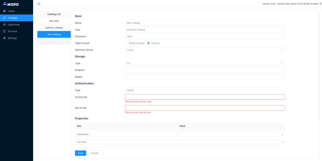 注册 catalog 的时候可以选择 Storage 是 S3,并且支持 AK/SK 验证体系。