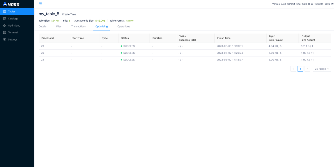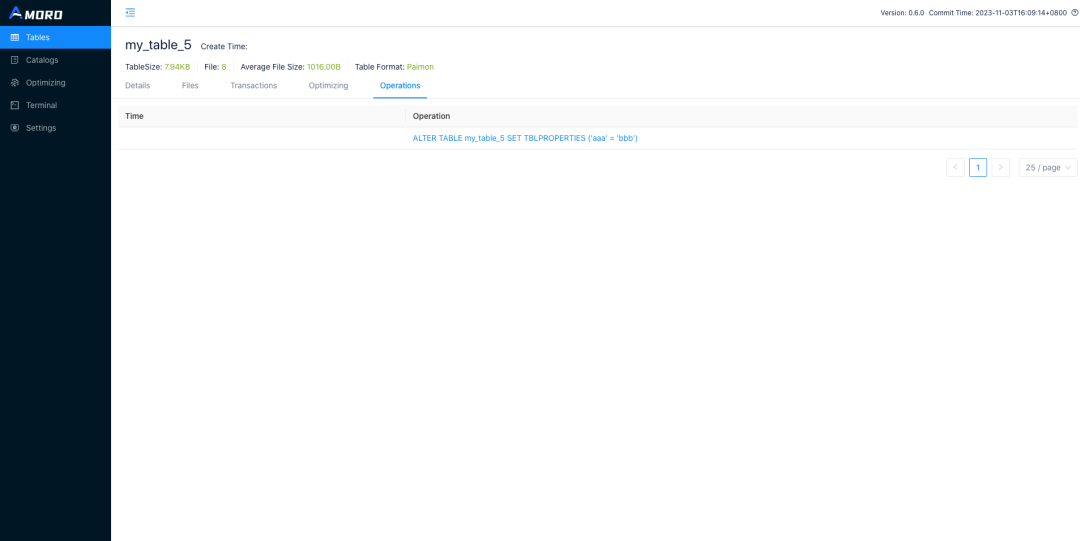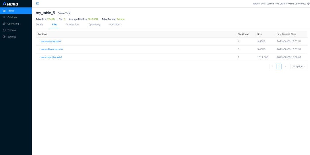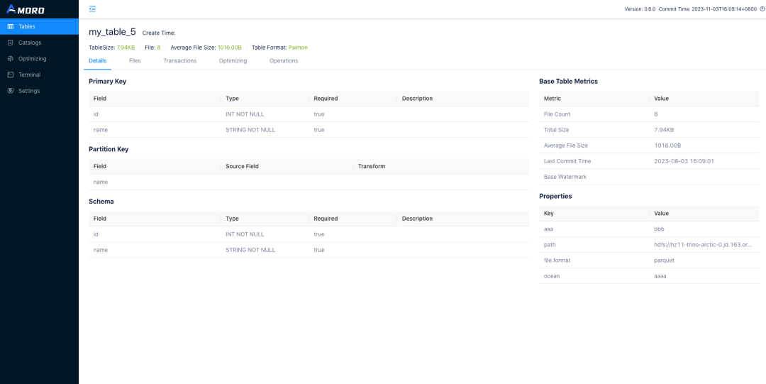 注册完 catalog 以后,可以在 Tables 页面查看表的 Schema, Properties, Files, Snapshots, Optimizing, Operations等信息。