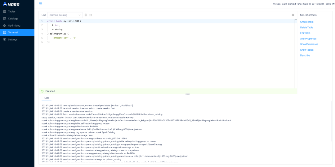 可以在 Terminal 界面执行 paimon 支持的 Spark sql。