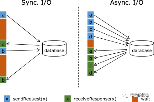 图中棕色的长条表示等待时间,可以发现网络等待时间阻碍了吞吐和延迟,为了解决同步访问的问题,异步模式可以并发地处理多个请求和回复,也就是说,你可以连续地向数据库发送用户a、b、c等请求,与此同时,哪个请求的回复先返回了就处理哪个回复,从而连续的请求之间不需要阻塞等待,如上图右边所示。这也正是 Async I/O 的实现原理。