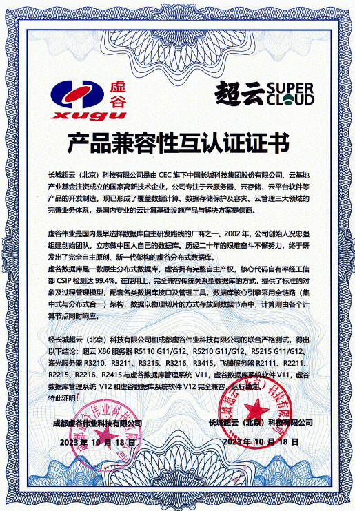 超云X86服务器R5110 G11/G12、R5210 G11/G12、R5215 G11/G12, 海光服务器R3210、R3211、R3215、R3216、R3415, 飞腾服务器R2111、R2211、R2215、R2216、R2415 与虚谷数据库管理系统V11.0、V12.0, 虚谷数据库系统软件V11.0、V12.0完全兼容,运行稳定,支持良好,可为企业级用户提供全面保障。