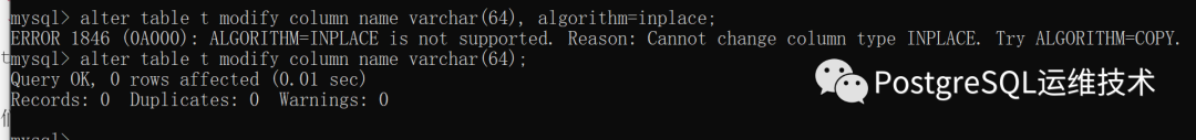 此外,减少varchar字段的长度,也不能使用inplace,需要使用copy算法。