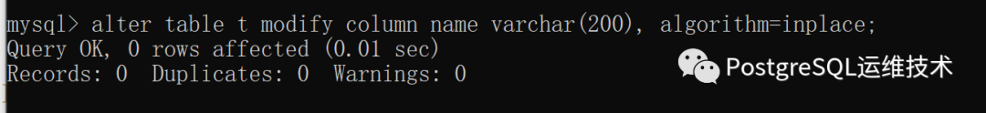 我们先试试使用inplace算法将varchar(20)改为varchar(63)。
