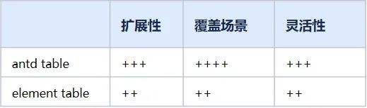 鉴于ant-design-vue上正好有table组件,对此我们对比了antd的table组件和element的table组件。2 种表格对比来看,ant-design-vue参照ant.design的React版开发出来,配置相对element更丰富,考虑到本身复杂场景支持性,更适合深度定制,最终选择了ant.design的vue版本。