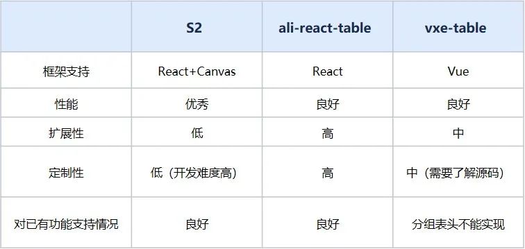 我们对比了react,vue及canvas生态有代表性的表格组件。综合三者优劣势最终确定了基于react的table组件。