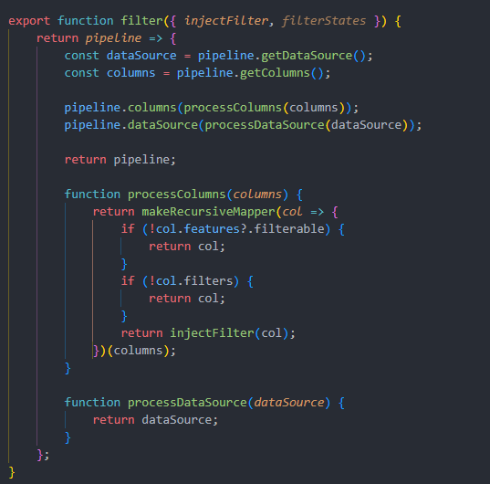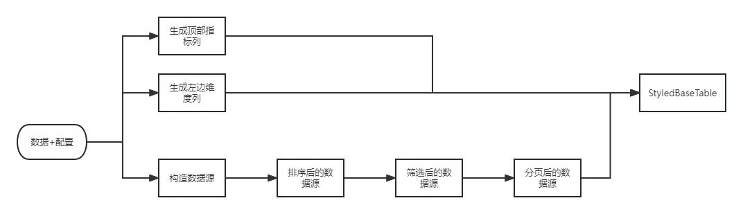 后端接口返回数据和配置部分,基于渲染模型:左树 + 上树 => 表格,根据配置生成左树leftTree和上树topTree,构造数据源,参照了ant-design的Table组件数据源构造的流程,与自身的pipeline插件机制结合,实现了表格的交互操作(排序,筛选,分页)。