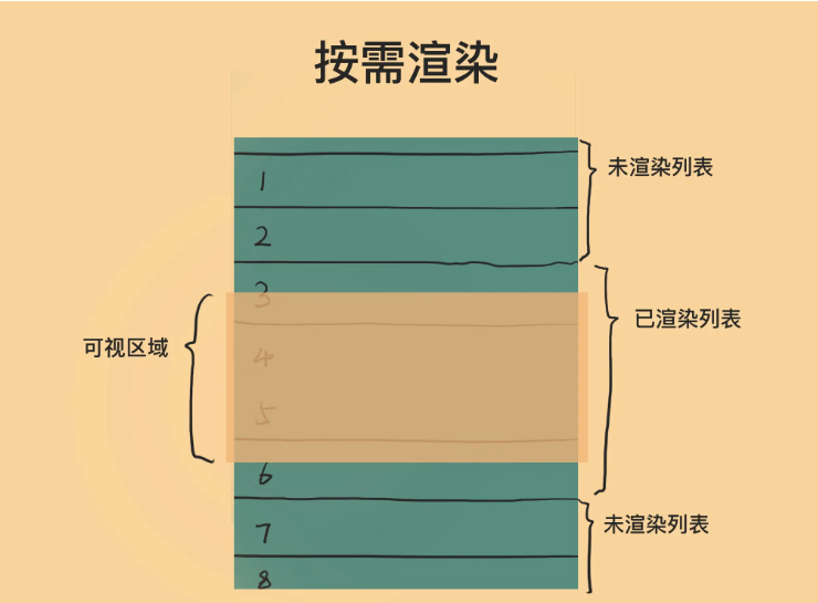 在滚动事件触发后,根据滚动 Offset 调整相应渲染的内容即可。在用户看来,还是一个完整的长列表。这种懒加载的方式,和早期页面图片资源懒加载和非必须资源异步加载属于同一种思路。