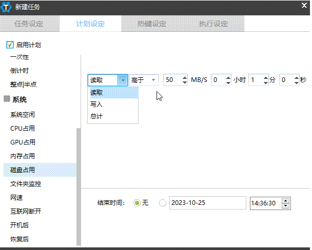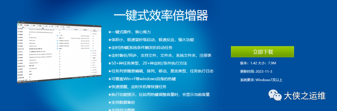 体积小,仅8M,占用极少的资源,运行快速。 支持各种定时计划,例如分钟、小时、天、周、月、年、指定日期、倒计时、整点半点循环,并支持农历。 还支持系统条件触发,例如根据系统空闲时间、文件夹监控、CPU|GPU|内存|磁盘占用、网速、开机延迟、休眠恢复后延迟等条件触发。 支持提醒、关机重启等、报时、挡屏休息、文件备份、音量调节、静音,窗口|显示器控制,多媒体、截图、录音录像,程序、进程、服务等操作,更换墙纸,系统清理,网络操作,文本搜索、热键转发等,应有尽有。 任务既可以用定时或者条件触发,也可以用热键触发,灵活组合。 任务日志,方便查看任务执行情况。 定时/热键备份/同步文件,文件夹,注册表等,相当于备份软件。 各种监控,文件夹监控、CPU|GPU|内存|磁盘占用、网速等。