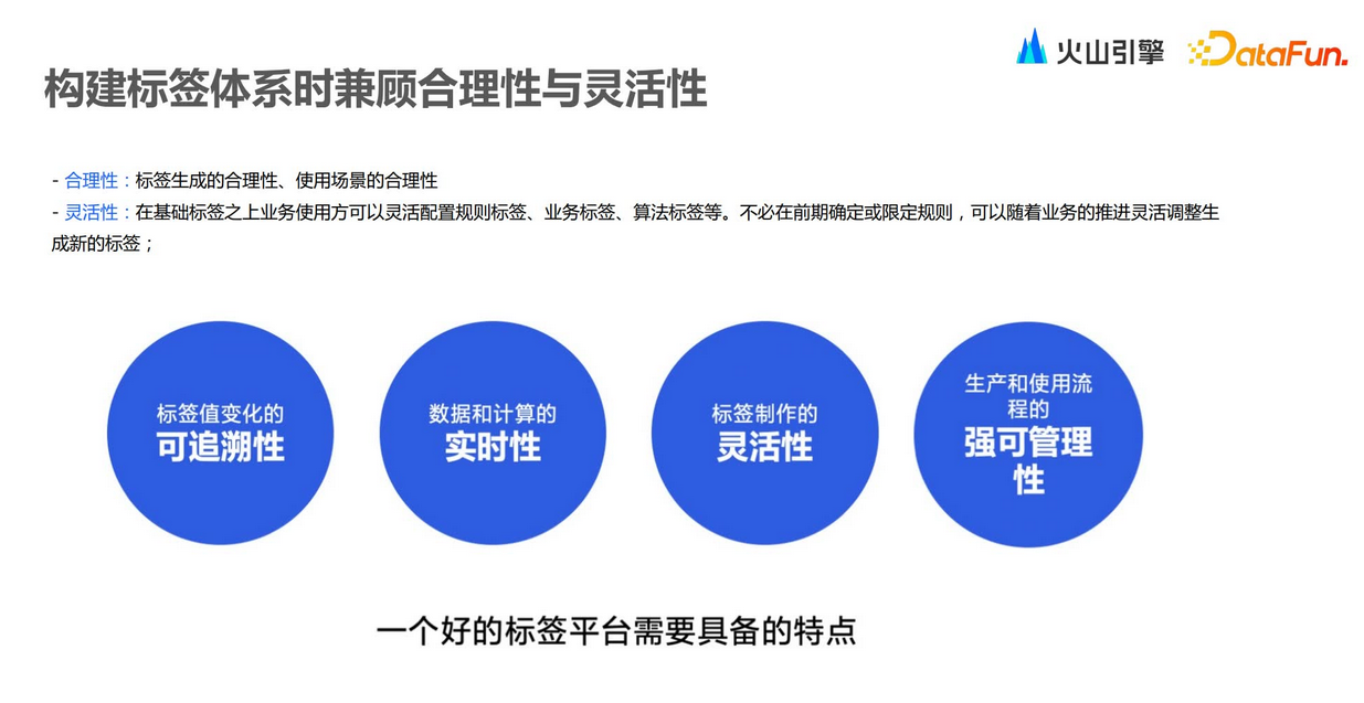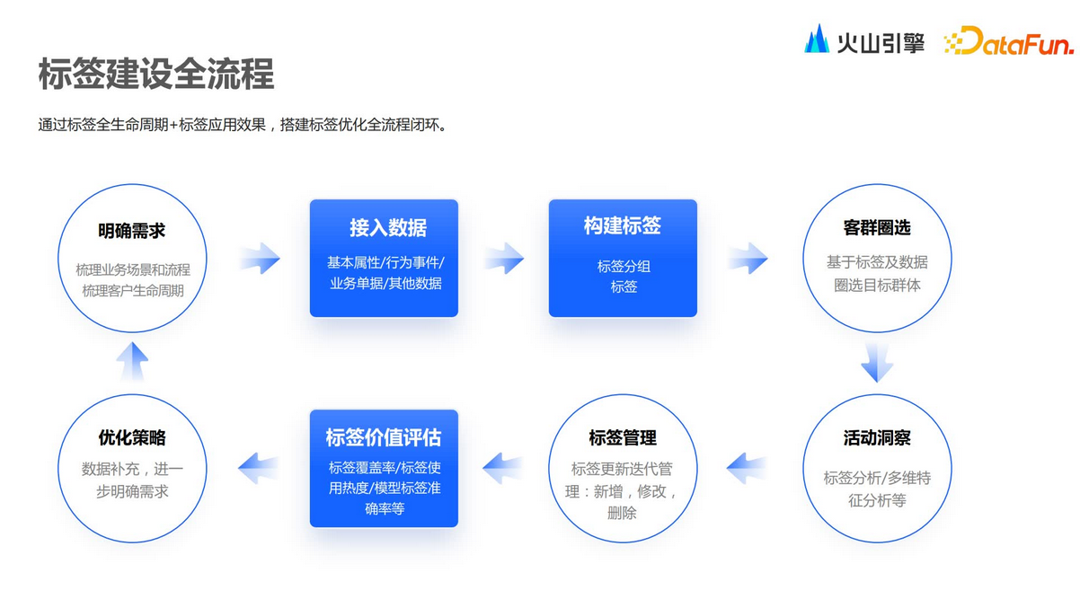 构建标签体系的时候需要兼顾合理性和灵活性。合理性主要是从业务视角出发,而灵活性主要是工具的视角,需要满足各类业务场景。下面从四个细化的层面去介绍。首先,可追溯性,指的是可以对标签做一些历史的回溯,通过洞察标签变化,可以了解到整个客群全生命周期的变化,同时也可以了解整个营销活动的执行效果。其次,数据和计算的实时性,标签可以分为实时标签和离线标签。实时标签能够支持对营销要求更高的一些场景,例如金融行业储值金额达到一定数值的时候,需要实时去做一些营销,此时标签的构建是依赖实时数据,实时生产的。再次,标签制作的灵活性,上文也提到在构建标签的一些数据和规则方面,执行频率都可以灵活配置。最后,生产和使用流程的强可管理性,会体现在标签的权限方面,以及服务上下游的相关应用,例如对外提供的一些API,提供数据输出的能力、Kafka消息订阅的能力、记录标签的增删改查相关信息、标签的上下架操作、标签审批的管理等。大部分客户在构建标签时会遵循一个标准流程,如下图所示。第一步是明确需求,梳理业务场景和流程。之后就可以知道如何接入何种数据,上文也提到,接入的数据一般是包括属性行为,以及业务相关单据的数据。接入这些数据之后,接下来就可以构建规则,真正把标签构建出来,其中包括一些标签的分组以及层级的构建。标签构建之后,就可以去圈选目标人群,从而去做一些营销活动。对这些活动进行洞察,同时结合标签事件等各种信息就可以更好地去做标签管理,修改标签规则,重新上下架一些标签。其中也可以去做标签的价值评估,即哪些标签是更有意义的标签,标签后期的建设方向等。最后会产生优化策略,它会体现在新需求的输入,从而形成一个全流程的循环闭环。在企业内部,整个标签体系的构建,其实是一个持续构建的过程。/ 明确标签建设目标 /