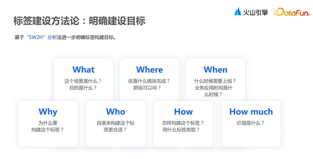 第一,What,即针对何种场景,例如客户生命周期场景或是会员营销场景。第二,Where,即依赖什么样的功能模块,例如是否需要一个算法标签或是基本的规则标签,是否需要依赖于群组的一些信息。第四,Why,即构建标签的原因,例如需要做洞察或者营销转化,又或是需要服务于客户,做一些客户关怀。第五,Who,即谁构建标签,如前文所述,可能是业务也可能是IT相关人员,其所用的标签工具也会不同。第六,How,即如何构建标签,例如构建RFM标签、统计标签,或是普通规则标签。最后,How much,即构建标签能够产生多少业务价值。/ 标签体系设计 /