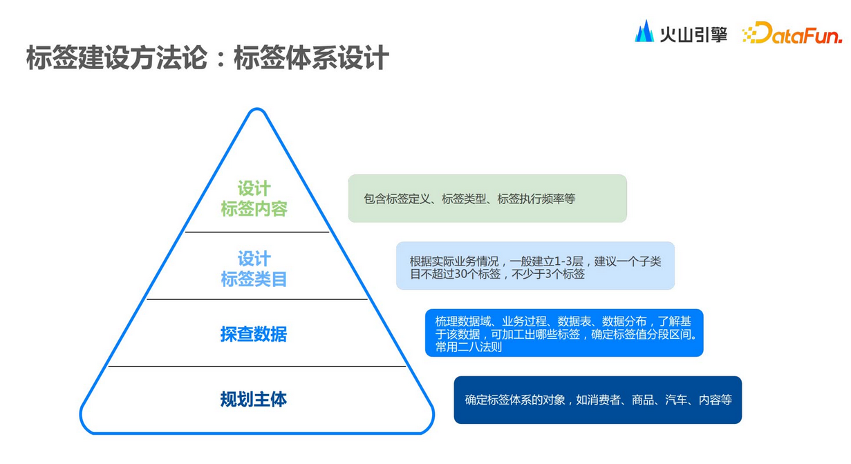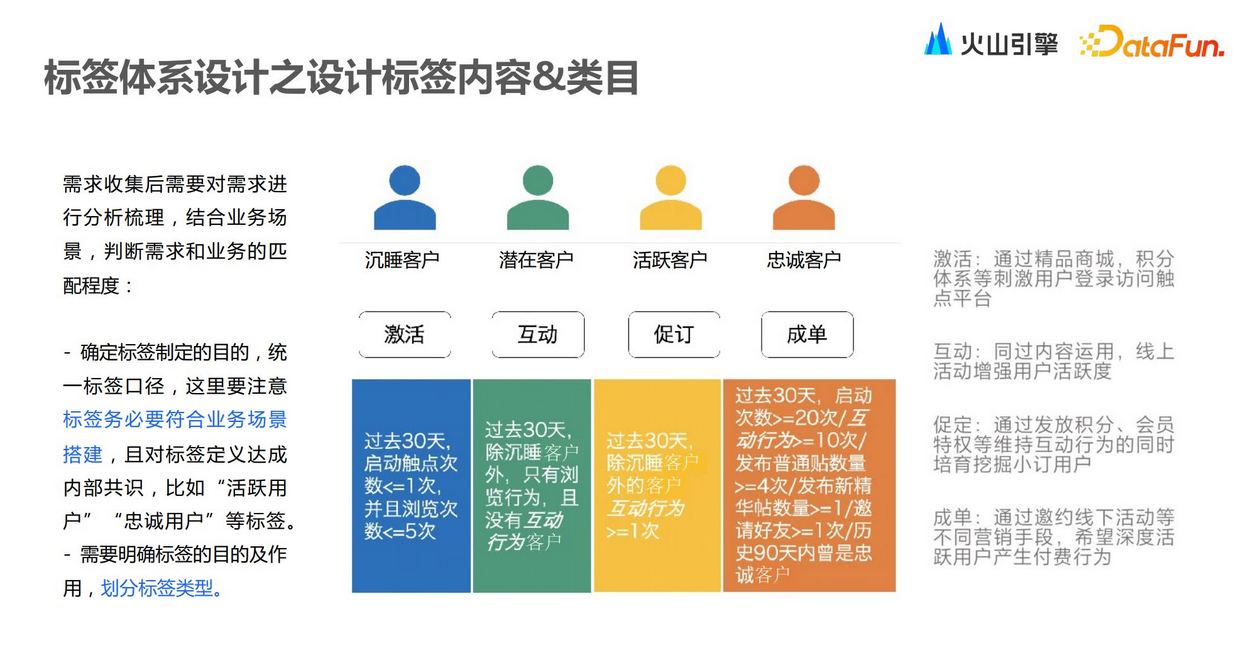 从标签体系的整体设计来看,第一步是最底层的规划主体。此时需要去梳理各个主体对象,梳理对象主体之间的关联关系,梳理数据源和具体数据类型。接下来就是探查数据,包括前文讲到的基本属性、行为数据、订单数据等,数据是实时还是离线,如何去接入。数据梳理清楚之后,我们需要构建标签类目。数据产生之后,会先做一些探查式分析,从而可以了解客户群体是何特征,之后再去构建标签类目,拆分类目。最后需要把标签内容设计出来。整个设计标签的过程中,前期规划、内部对齐、标签口径对齐以及数据梳理,都是非常重要的。/ 标签内容和类目的设计 /