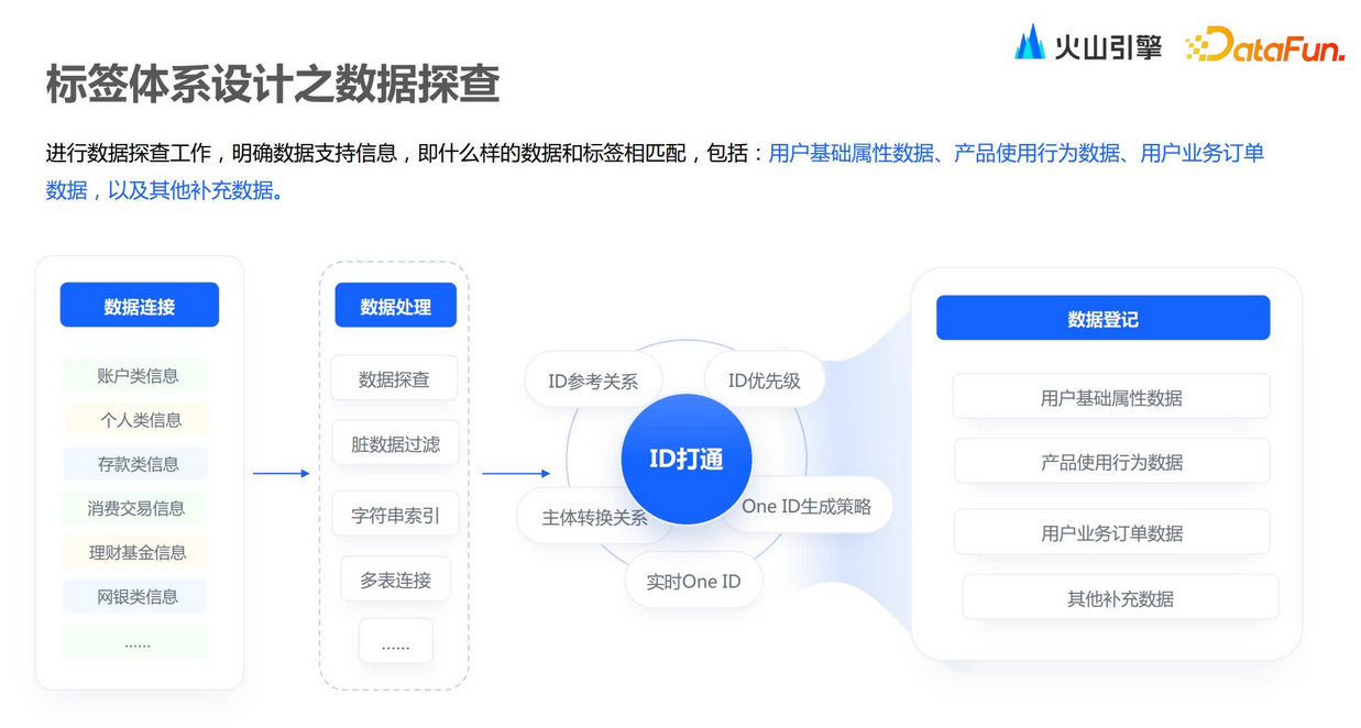 接下来介绍标签体系的数据链路,具体包括VeCDP系统中数据采集的步骤和标签构建的方法。首先要做标签相关数据的采集,需要连接外部各种各样的数据源。数据采集完成之后,需要做数据的加工处理,针对这些数据需要做ETL以及表间join操作。接下来是VeCDP系统中的一个核心能力——ID打通。火山引擎VeCDP会设计ID的优先级、生存策略以及参考关系,之后把各渠道ID做整体的融通。最后我们把数据落到VeCDP中,成为基础的属性数据、行为资料,以及业务订单数据,还有一些其它的明细数据和维度数据。/ 规划主体 /