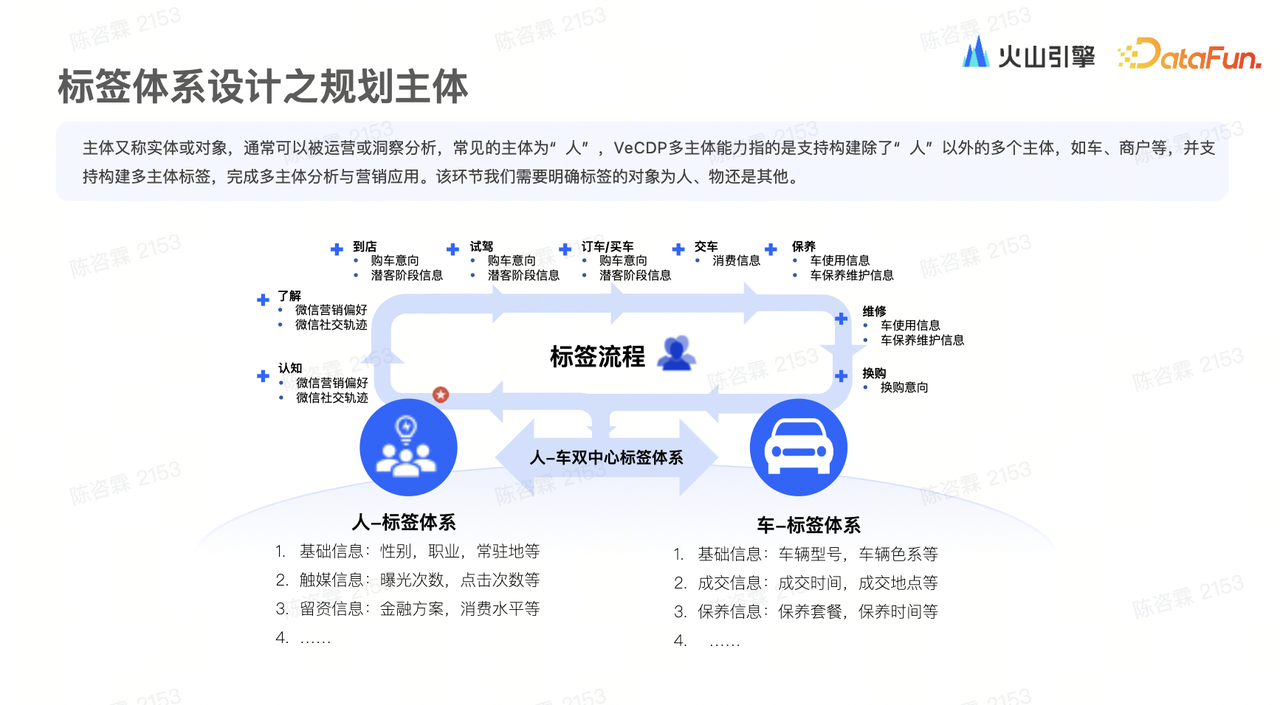 主体又称实体或对象,针对不同的行业,规划出来的主体也是不一样的。例如汽车行业,通常将业务对象梳理成两个主体,即人和车。围绕着人的标签体系,包括基础属性信息,在一些媒体点位的互动行为信息,以及留资相关信息等。同时围绕车,会有一些汽车相关的信息,包括维修保养以及车联网采集到的信号信息。在其它行业,也是类似地,可以梳理出不同的主体。/ 标签加工与更新 /