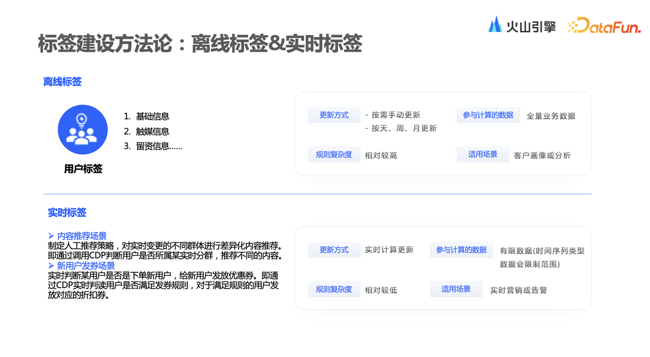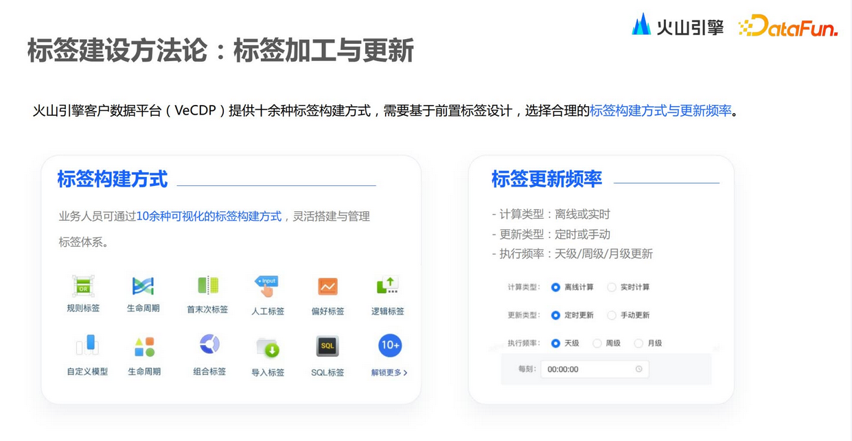 接下来基于梳理出来的主体去构建标签。在火山引擎VeCDP中,提供了十几种标签构建的方法。其中规则标签是基于一些规则去组合,生命周期标签是围绕其生命周期去打标签。首末次标签是基于用户首次及末次行为去构建一些标签。偏好标签,需要统计用户行为信息,观察用户集中行为聚集在哪些方面,之后做一些排序,就可以得出偏好信息。标签的更新频率,可以设置整体上是实时还是离线,如果是实时计算,理论上就是一个实时标签。如果是离线计算,可以去配置其更新类型,例如手动更新还是定时更新,执行的频率可以选择天级、周级或者月级等等。/ 离线标签与实时标签 /