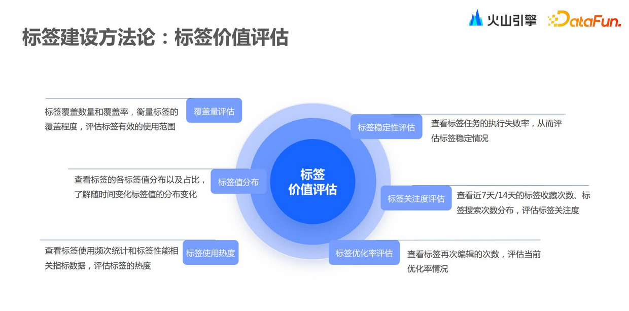离线标签和实时标签有着不同的适用场景,在规则和一些限制方面都会存在差异。从更新方式来看,离线标签会更强调手动更新或者按周期去更新,而实时标签则是实时计算,一般是由某个行为事件或者某个消息触发去做实时更新。从参与计算的数据来看,离线标签基本上是全量的业务数据都可以参与计算,而实时标签则需要考虑计算的性能,是有限的数据参与,针对一些时间序列数据,像订单数据和行为数据,可能会限制一定的时间范围,例如一天或七天内。从复杂性来看,离线标签复杂性相对会更高,实时标签相对低一些。从适用场景来看,离线标签主要用于画像分析,实时的要求不那么高。但是实时标签可能会在一些实时营销,当达到某个标准之后要实时地给用户发券或者是告警。/ 标签价值评估 /