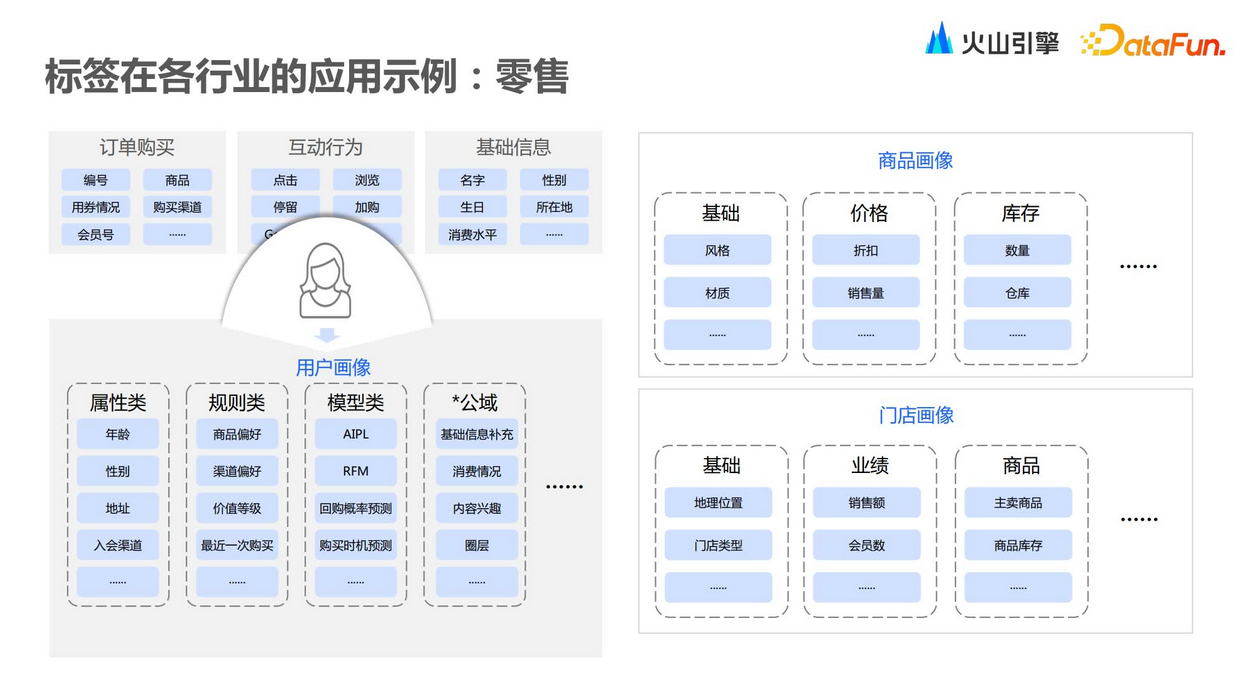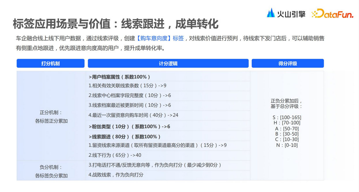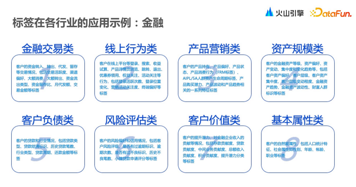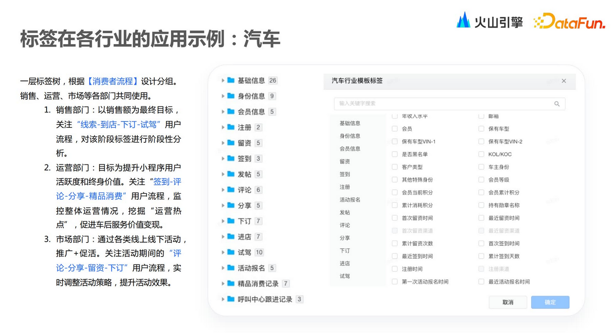 在应用标签的过程中,可以通过采集标签在系统中的使用信息,进行价值评估。第二,标签值的分布,包括标签值随时间的变化以及趋势。第三,标签使用热度,哪些标签是高频使用的,哪些是相对低频使用的。第四,标签稳定性,由于标签本身依赖于各种各样的上游数据,不同的上游数据会导致标签在实际计算的时候,整体稳定性是有差异的。最后,标签优化率评估,主要是指标签在持续应用的过程中,哪些标签可能会被频繁变更。通过评估以上维度,可以得知哪些标签高频应用、哪些标签有价值、哪些标签可以持续做优化,从而指导后期标签体系的构建。每个行业都有不同的标签体系,零售行业会根据用户画像和订单行为构建标签和画像;汽车行业关注线索到店、线上互动和市场活动等流程;金融行业主要基于客户交易、资产和负债情况构建风险评估和客户价值评估。除此之外,火山引擎VeCDP还会在一些泛互联网行业中应用,所以整个标签更体现其工具性。在汽车行业,我们会按照消费者生命周期以及使用流程,去构建其标签体系,包括基本信息、行为数据。行为数据包括线上行为以及线下行为,以及消费信息、售后信息。汽车行业是高客单价的行业,因此更注重售后的管理。另外,在一套标签体系下,不同部门关注的点是不一样的。销售部门会更关注线索、到店、下订、试驾这样的用户流程;运营部门则更关注线上互动,包括签到、评论、分享以及精品消费等等;市场部门会更关注整个市场活动的留资、下订行为。零售行业相对而言标签会做得更加精细化。围绕用户画像,通过其订单互动行为、基础信息,去构建整体标签规则和画像。另外,零售行业除了使用第一方的数据,同时也会去采集第三方的数据做一些补充,然后去构建其完整的画像。除了用户画像,零售行业还会做商品画像,商品作为一个独立的主体,围绕商品的一些基本信息、价格策略、库存信息以及售卖情况去构建标签和画像。最后还有门店画像,包括门店地理位置、类型、门店业绩以及在售商品等。在零售行业会利用各个主体之间产生的关联关系来构建一些标签,例如用户和门店之间,用户会有到店的动作,用户在门店中有消费动作,包括用户买了何种商品、浏览了何种商品,通过类似关联关系的组合去做营销。首先是原始信息,包括客户交易、客户资产、客户负债以及客户持有的产品情况。基于这些内容,可以去构建客户风险评估,以及客户价值评估,从而构建整个标签体系。标签体系的构建是一个完整的闭环,通过活动数据可以进行分析洞察,根据洞察结果留存好的标签,抛弃不相关的标签,形成企业合适的标签库。在高客单价营销场景中,针对一些线索,会围绕线索做标签的打分,生成一些数字类型的标签,包括正向打分机制和负向打分机制,最后得到总分作为线索的评分。正分机制包括属性信息、信息完整度、最近的互动行为信息以及留资信息,以及客户本身跟销售员的互动信息。