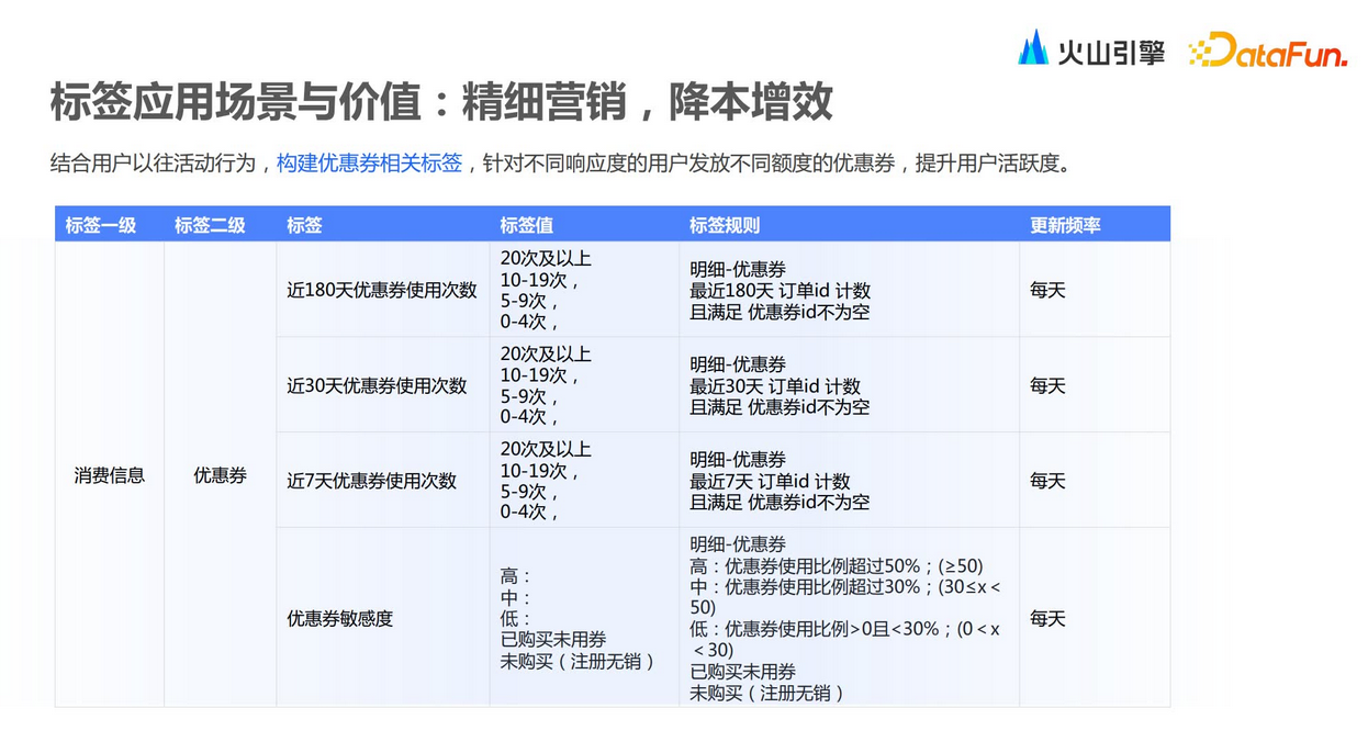 精细化营销更多是体现在一些低价高频的营销场景,例如发放优惠券的场景。首先把一些客群批量圈出,围绕优惠券使用场景,比如最近180天用券次数、最近30天用券次数、近7天用券次数,以及客户对优惠券的敏感度。有一些客户可能会更关注低价优惠券,希望打折力度更大。基于优惠券使用的信息,可以给客户做一些标签画像,去服务于上层的营销场景。基于标签可以去做一些分析洞察,比如客户行为分析、画像分析、流程分析等。首先构建好标签,然后去做活动,之后会产生活动数据,基于活动数据,可以再做一些分析洞察。分析洞察后可以得知哪些标签可以促成转化,哪些标签跟整个活动效果是不相关的。从而可以把好的标签留存下来,去服务于下一个标签体系的构建。不合适的标签就可以逐步抛弃掉,最终形成适合企业的标签库。面向业务增长的客户全域数据中台,帮助企业打破数据孤岛,建立统一的人、物档案,以数据驱动全链路营销和深度运营,实现企业数字化转型和增长。后台回复数字“11”了解产品