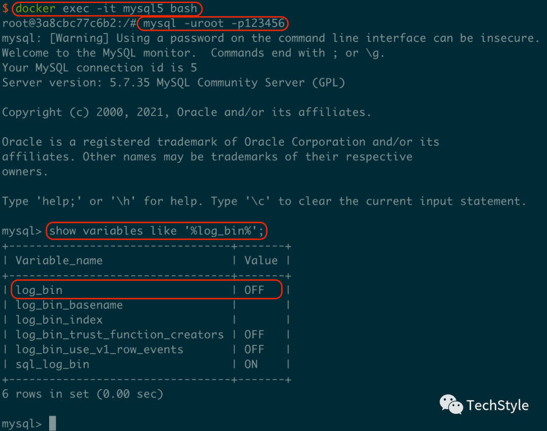 docker exec -it mysql5 bashmysql -uroot -p123456show variables like '%log_bin%';