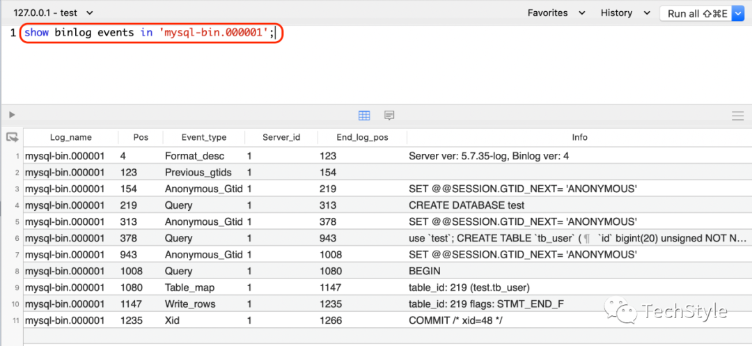 在数据库中创建一个数据库、表,插入一些数据后,在MySQL DB Client 端查看 binlog