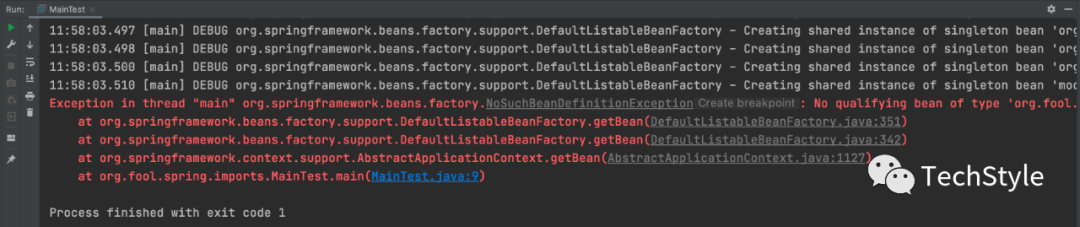 Exception in thread "main" org.springframework.beans.factory.NoSuchBeanDefinitionException: No qualifying bean of type 'org.fool.spring.imports.MockUserBean' availableat org.springframework.beans.factory.support.DefaultListableBeanFactory.getBean(DefaultListableBeanFactory.java:351)at org.springframework.beans.factory.support.DefaultListableBeanFactory.getBean(DefaultListableBeanFactory.java:342)at org.springframework.context.support.AbstractApplicationContext.getBean(AbstractApplicationContext.java:1127)at org.fool.spring.imports.MainTest.main(MainTest.java:9)