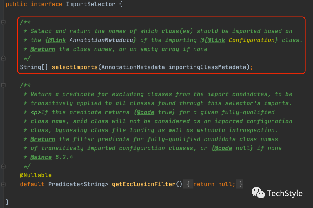 Note: ImportSelector 接口定义了一个selectImports 方法,英文注释写的很明白,选择哪些classes 需要被注册到Spring IoC 容器中,一般会和 @Import 注解一起使用。