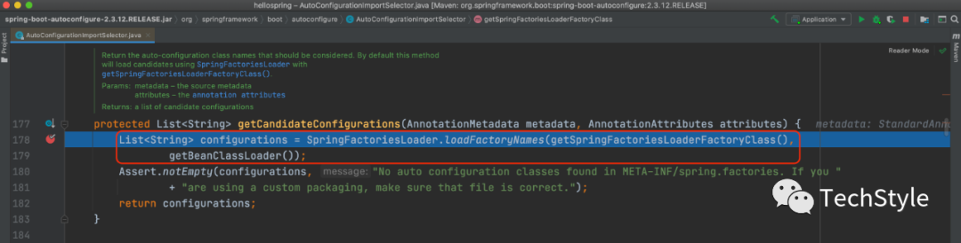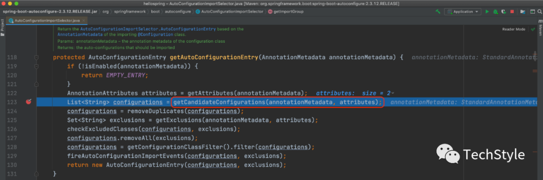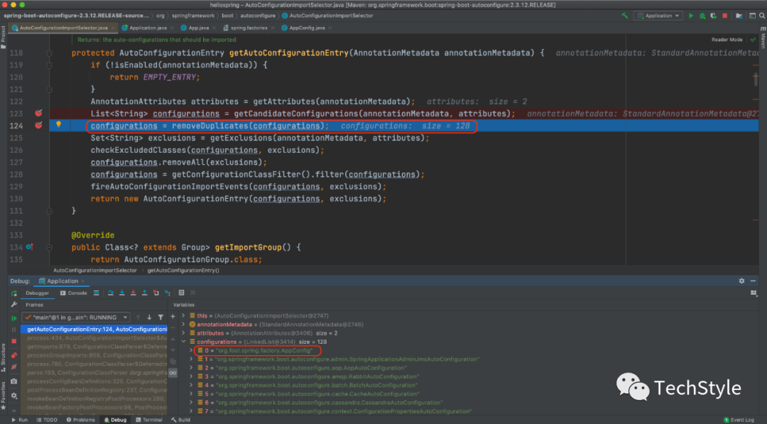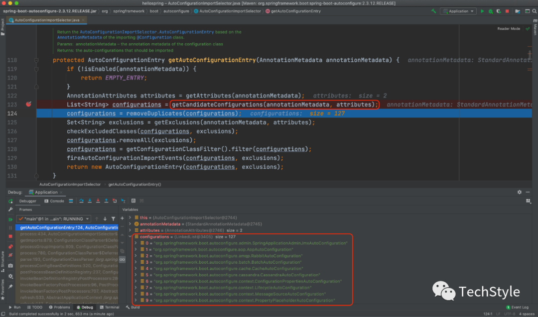 Debug Step7:执行完getCandidateConfigurations 方法后,可以看到在spring.factories 中的需要被装载到Spring IoC 容器中的127个classes