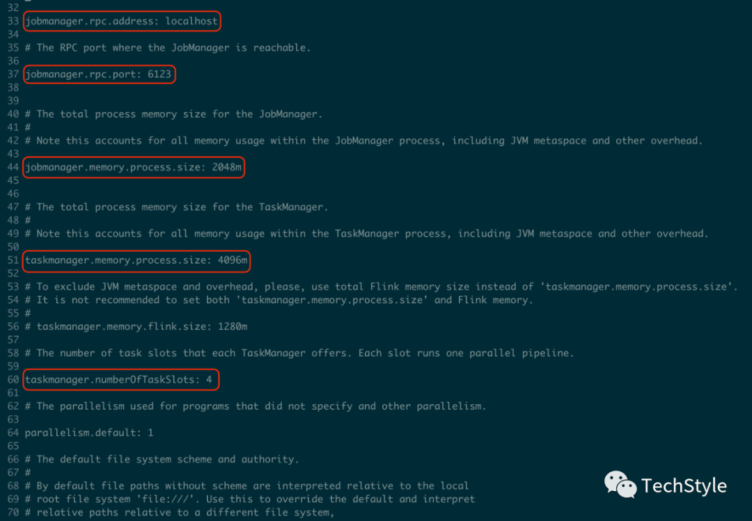 vi flink-conf.yamljobmanager.rpc.address: localhostjobmanager.rpc.port: 6123jobmanager.memory.process.size: 2048mtaskmanager.memory.process.size: 4096mtaskmanager.numberOfTaskSlots: 4rest.port: 8086