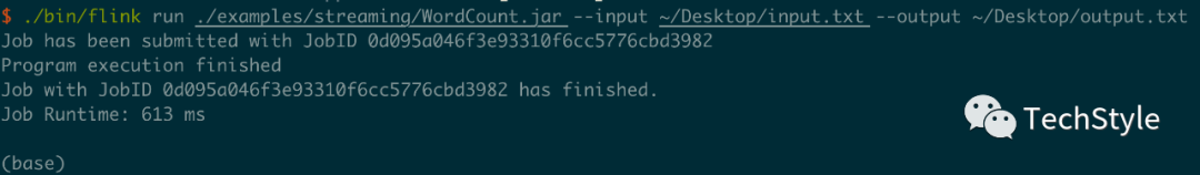 ./bin/flink run ./examples/streaming/WordCount.jar --input ~/Desktop/input.txt --output ~/Desktop/output.txt