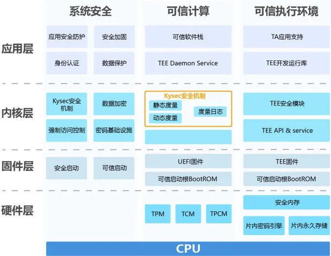 银河麒麟云底座操作系统V10支持核内核外一体化内生安全体系、安全审计、安全加固、国密算法组件等多重安全联防机制,并支持通用安全和可信计算,系统性地增强HostOS底层安全。