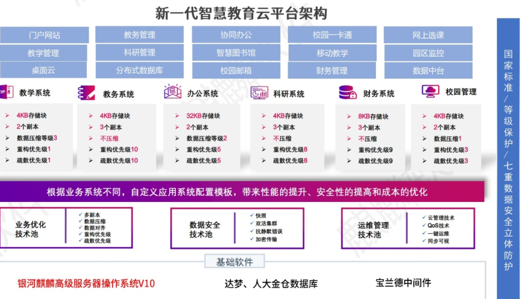 基于银河麒麟操作系统和安超国产化云底座的智慧教育云解决方案,聚焦业务、安全双视角,构建完善的云、网、安产品体系,助力学校及各类教育机构进行网信基底、安全能力与IT基础设施融合的最佳实践。通过对原有异构IT基础设施的统一纳管、升级和优化,在按需实现国产化局部或全局迁移的基础上,提升跨部门、跨校区IT业务的可用性、稳定性、效率和灵活性,同时关注校园数据库和物理全域管理各环节的差异化特性,打造安全防护、分析、决策、处置一体化的动态网络安全体系,真正实现智慧教育全方位安全高效转型。