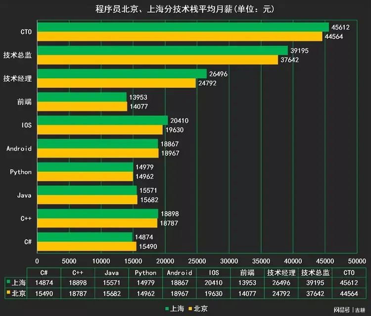 这里需要说明的是,在我查程序员全国薪资分布占比的数据时,招聘网站自动给我带出了一组数据,那就是不同技术栈、技术管理在全国各个城市的平均月薪情况,给出的结果均为北京、上海最高,所以,这组数据我们可以直接拿来用!