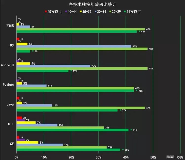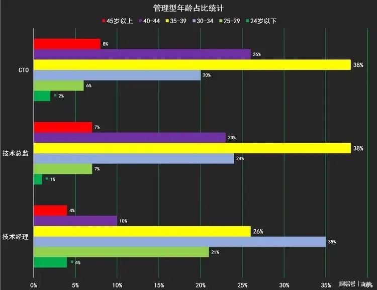 可以看出来普通程序员基本止步于35岁以后,而相对来说,技术管理30岁以上的占比反而比较高。