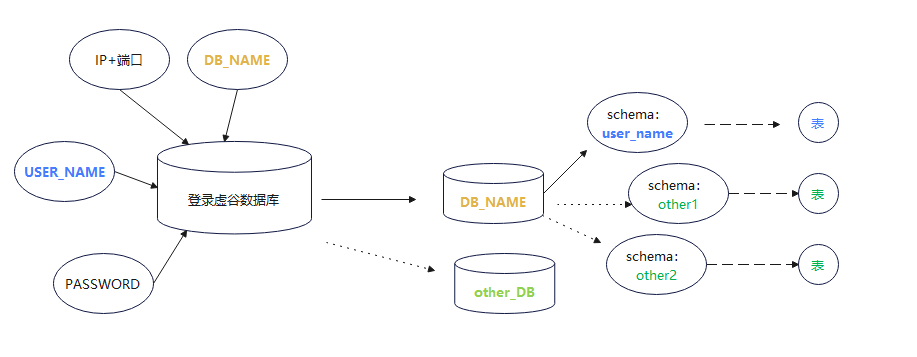 由上图来看,当我们登录虚谷数据库时,输入的数据库库名和用户名(账号),决定了登录后的默认库和会话属主。