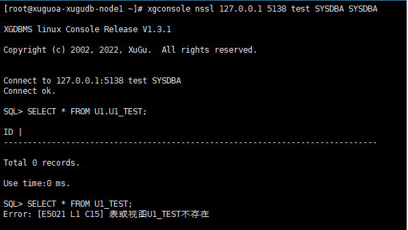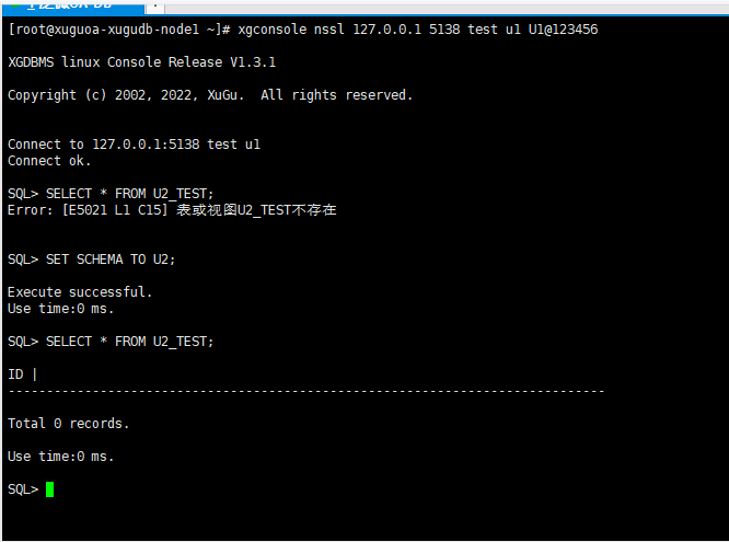 再次以U1用户登录库后,切换U2模式后访问U2模式下的表: