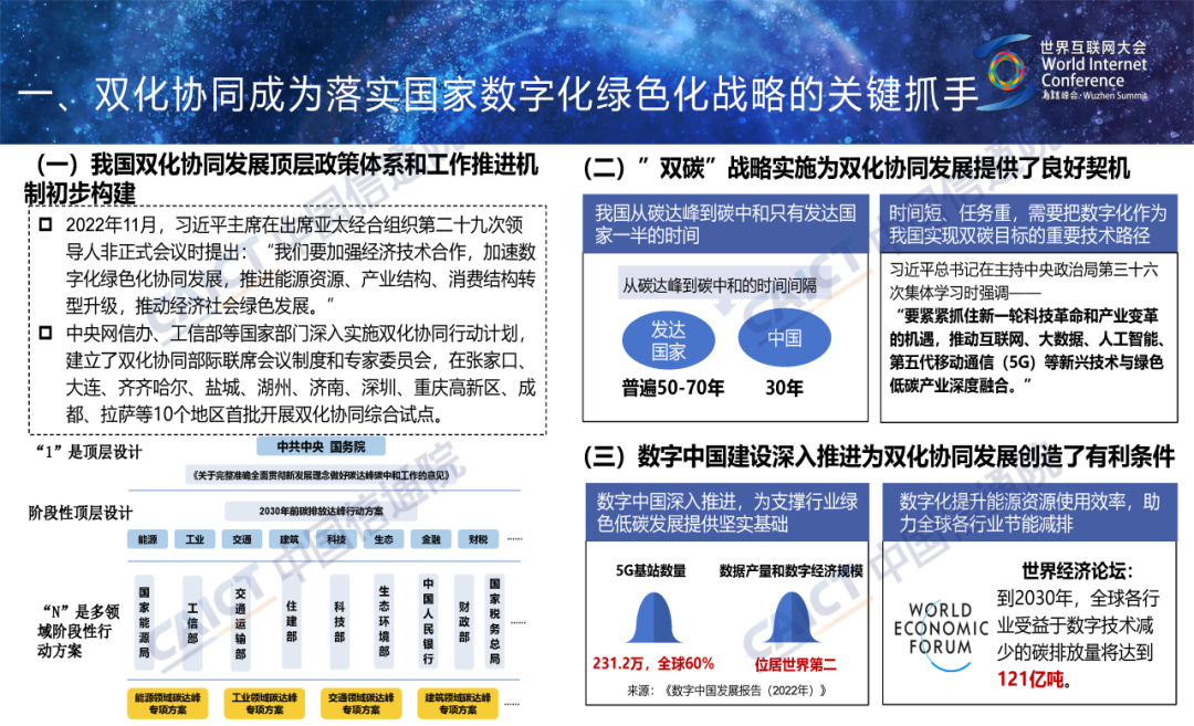 报告从我国双化协同取得的成效、数字产业能耗能效、数字技术赋能行业绿色化转型、各地区双化协同发展关键举措等几个方面展开阐述。