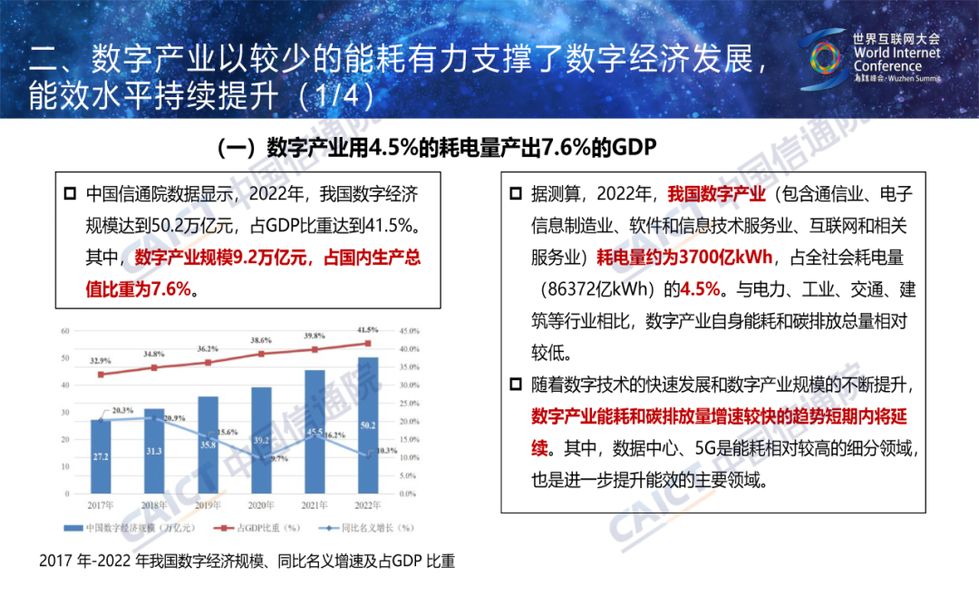 数字产业以较少的能耗有力支撑了数字经济发展,能效水平持续提升。据中国信通院测算,2022年,我国数字产业耗电量约为3700亿kWh,占全社会耗电量(86372亿kWh)的4.5%。数字产业用4.5%的耗电量产出7.6%的GDP,有力地支撑了数字经济发展。