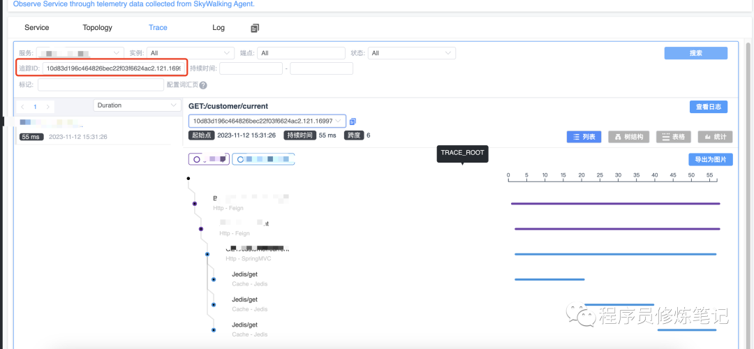 我们拿着traceId去查Skywalking页面上可以看到整个请求链路(如下图),同样的我们在Skywalking页面上拿到的traceId也可以去日志系统中拉取到所有的日志。