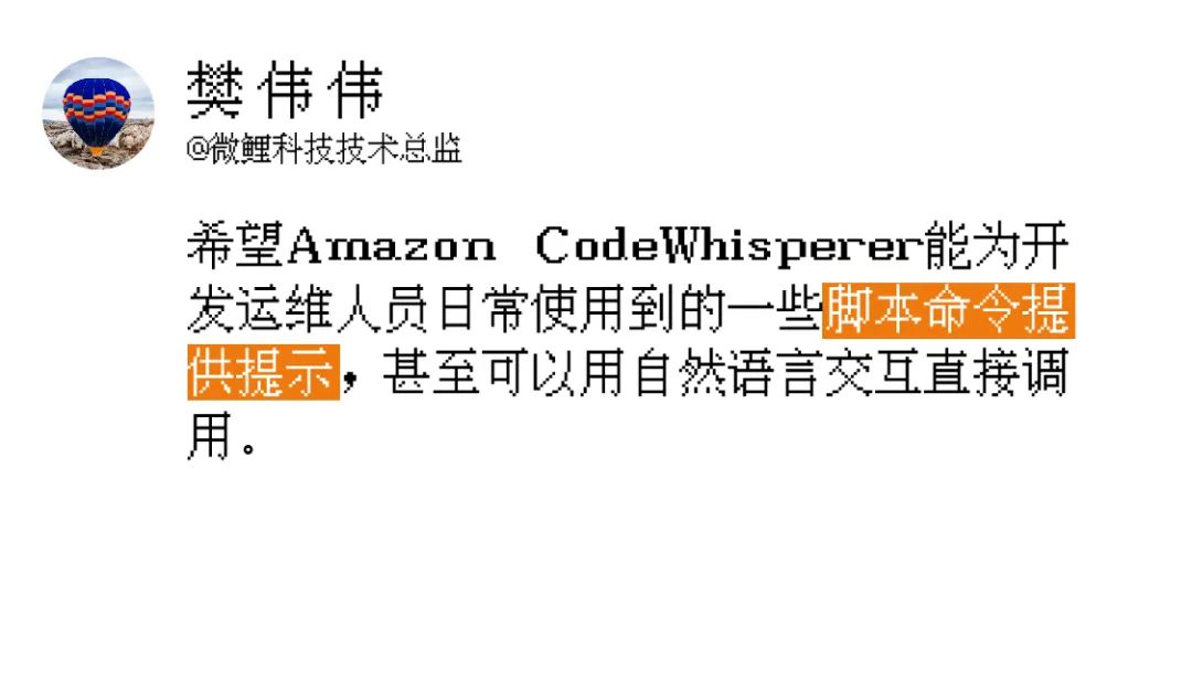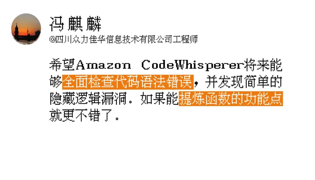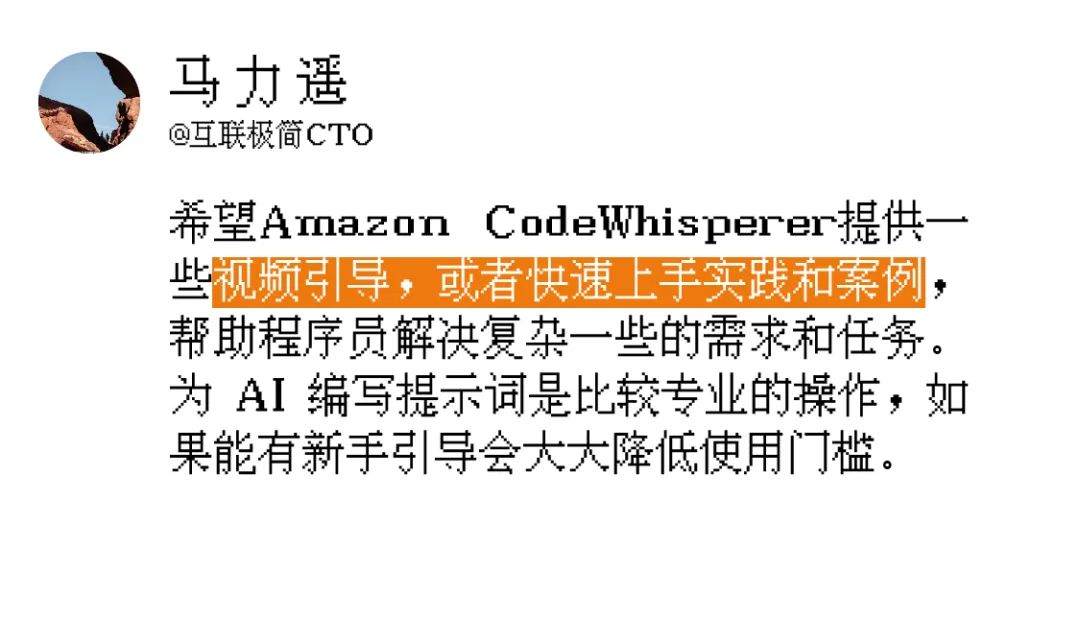 易用性是决定软件成败的关键之一,面向程序员的专业编程辅助工具更需要良好的易用性。那么本次受访的嘉宾对 Amazon CodeWhisperer 提出了哪些易用性方面的建议呢?
