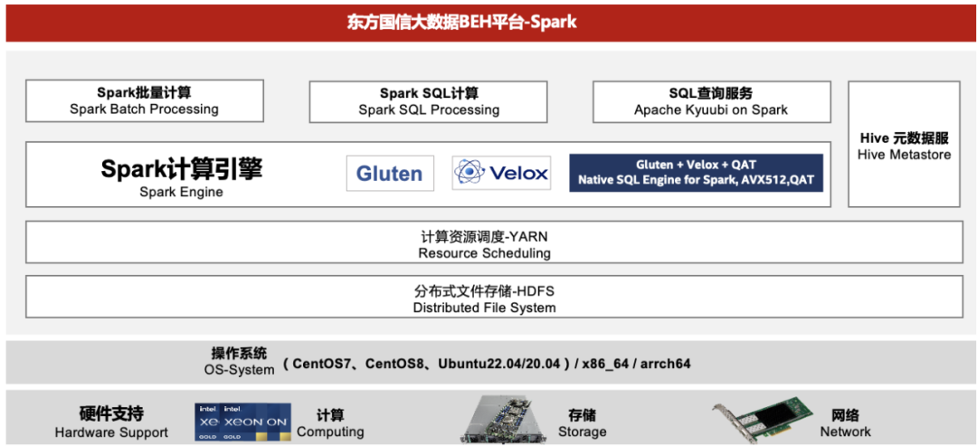 为了进一步提升 Spark 执行效率,东方国信在 BEH 平台中采用了第四代英特尔® 至强® 可扩展处理器,并利用处理器集成的 SIMD 指令集以及英特尔® QAT 来提升 Gluten +Velox Backend 向量化执行引擎的性能。