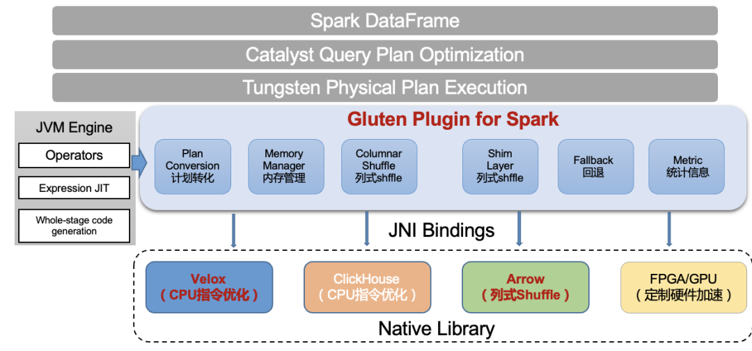 为了解决 Spark 执行效率的问题,东方国信大数据 BEH 平台集成了 Gluten + Velox Backend 向量化执行引擎。其中,Gluten属于 Spark 硬件加速项目,通过 CPU 的单指令多数据 (SIMD)指令集及加速库 (Velox 或 ClickHouse) 来使得 Spark 具备更好的向量化执行能力。Gluten 能够通过 Spark Plugin 的机制,拦截 Spark 查询计划并下发给原生引擎来执行,整体的执行框架仍沿用 Spark 既有框架实现。