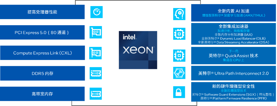 第四代英特尔® 至强® 可扩展处理器提供了出色性能和安全性,可根据用户的业务需求进行扩展。借助内置的加速器,用户可以在 AI、分析、云和微服务、网络、数据库、存储等类型的工作负载中获得优化的性能。通过与强大的生态系统相结合,第四代英特尔® 至强® 可扩展处理器能够帮助用户构建更加高效、安全的基础设施。