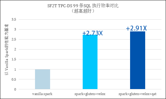 东方国信大数据 BEH 平台通过集成 Gluten + Velox Backend 向量化执行引擎,为 Spark注入了原生矢量化执行的能力,同时结合第四代英特尔® 至强® 可扩展处理器,以及处理器集成的英特尔® QuickAssist(英特尔® QAT)加速器,显著优化了 Spark 批处理计算、SparkSQL 计算、SQL 查询服务的执行效率。经测试,在相同硬件环境下,配合英特尔® QAT 的加成,Spark 计算性能可提升高达 2.91 倍。