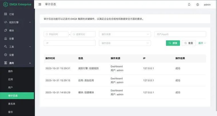 EMQX 新增的审计日志支持记录来自 Dashboard 、REST API 以及命令行的所有变更性操作,例如用户登录,对客户端、访问控制以及数据集成等资源的修改。